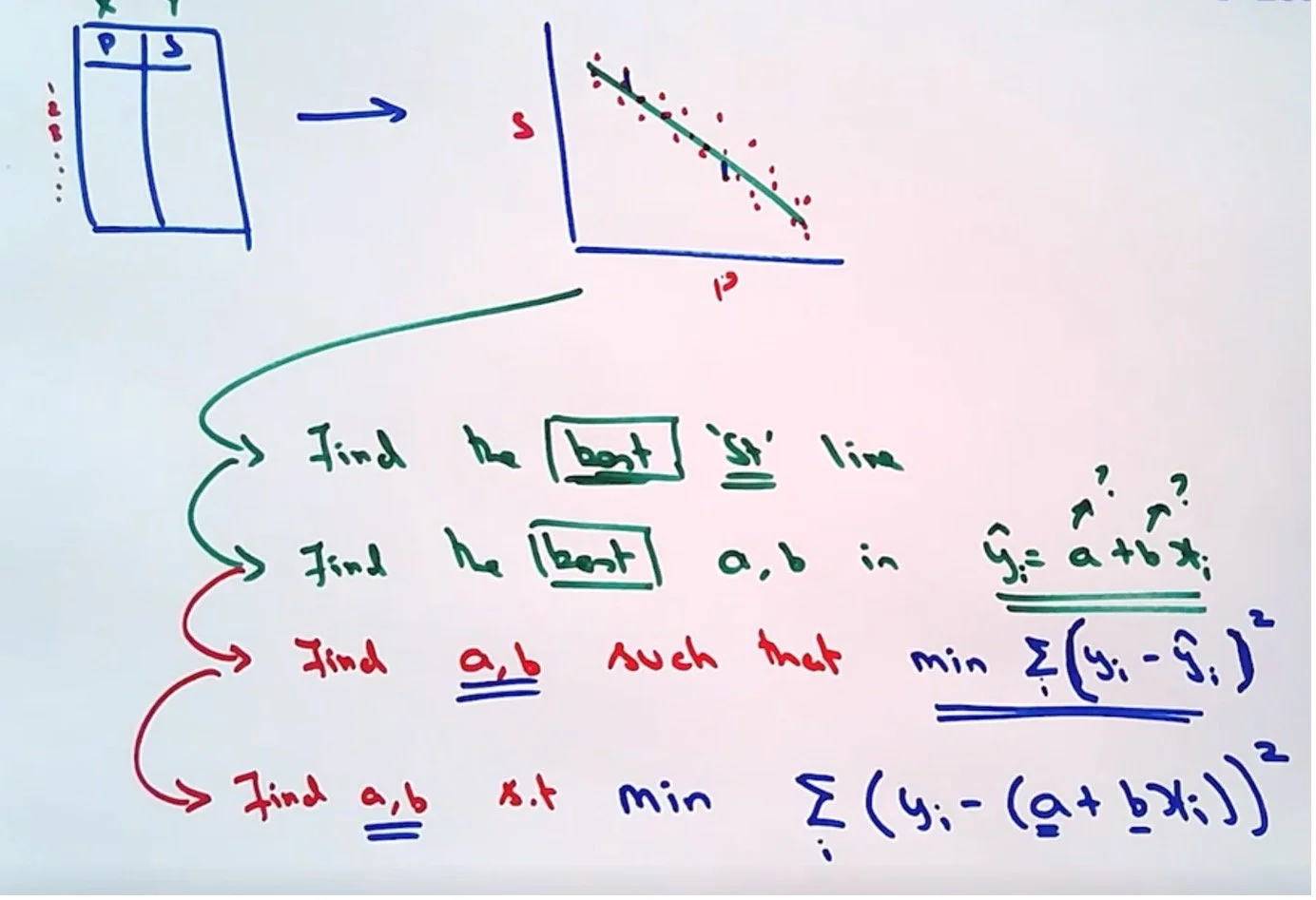 Here is a summary of linear regression problem - its about finding the best straight line that can describe the data, which is to find y (hat) that is the predicted value that has minimum difference from observed value (y), that is -to find a and b in the equation (y hat = a + bx) that leads to minimum value of the square of difference is minimised
